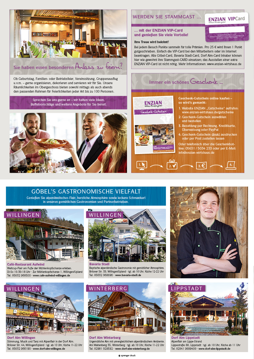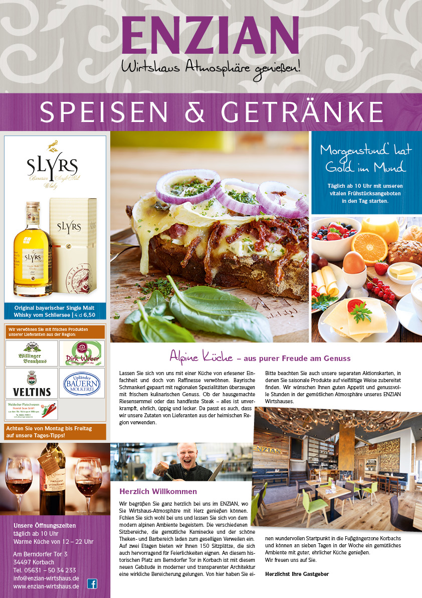 ENZIAN +. Das „Enzian“ blüht wieder in der Korbacher Innenstadt. Unter neuer Leitung. Die Familie Theloosen bietet ein kulinarisches Erlebnis mit dem gewissen Etwas mehr. Das zeigt schon das „+“, das den bekannten Name seit Kurzem ergänzt. Mit Begeisterung und Engagement hat die Inhaberfamilie das Traditionslokal übernommen und neu belebt.